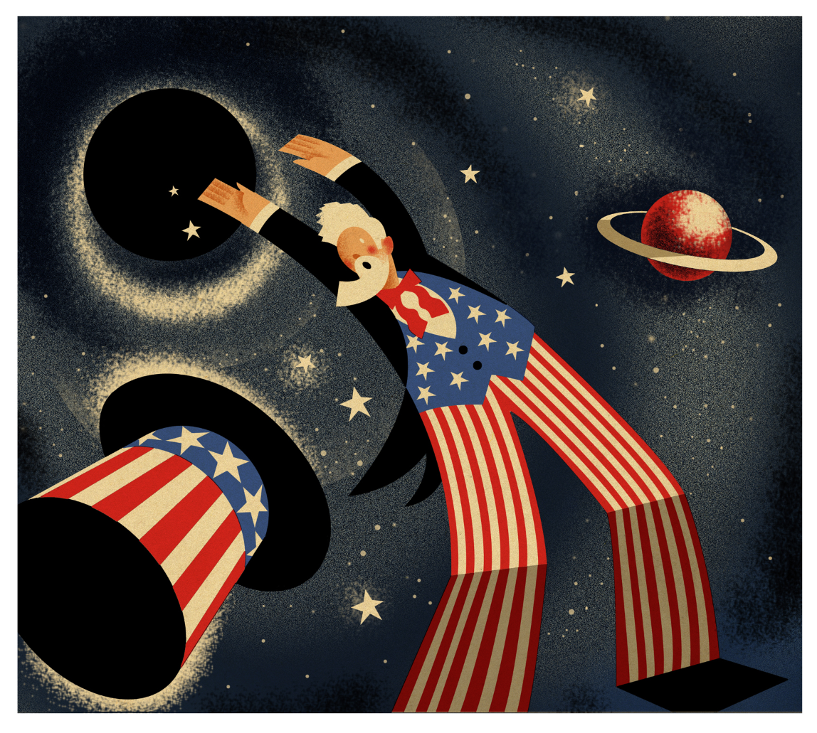 Illustration for the Wall Street Journal on the topic of "Big Government Imploding". The Art Director suggested doing Uncle Sam being sucked into a black hole.... Voila!